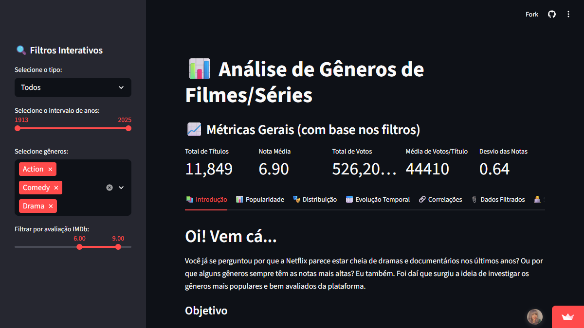 O pipeline foi construído em Python com Pandas para limpeza e tratamento dos dados, e Streamlit para a interface interativa. Os filtros foram projetados para permitir exploração não-linear — o usuário descobre os padrões no próprio ritmo, sem precisar saber de antemão o que procura.